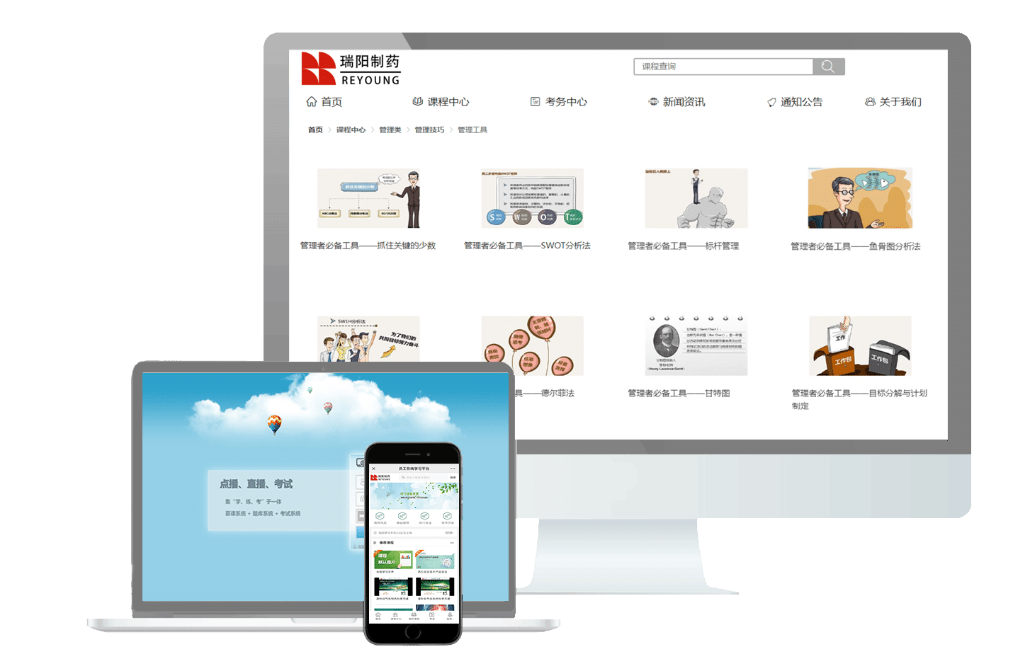 我们根据客户需求,可以定制化开发符合您的可支持在线学习、考试于一体的培训平台,同时支持PC、移动端、小程序。