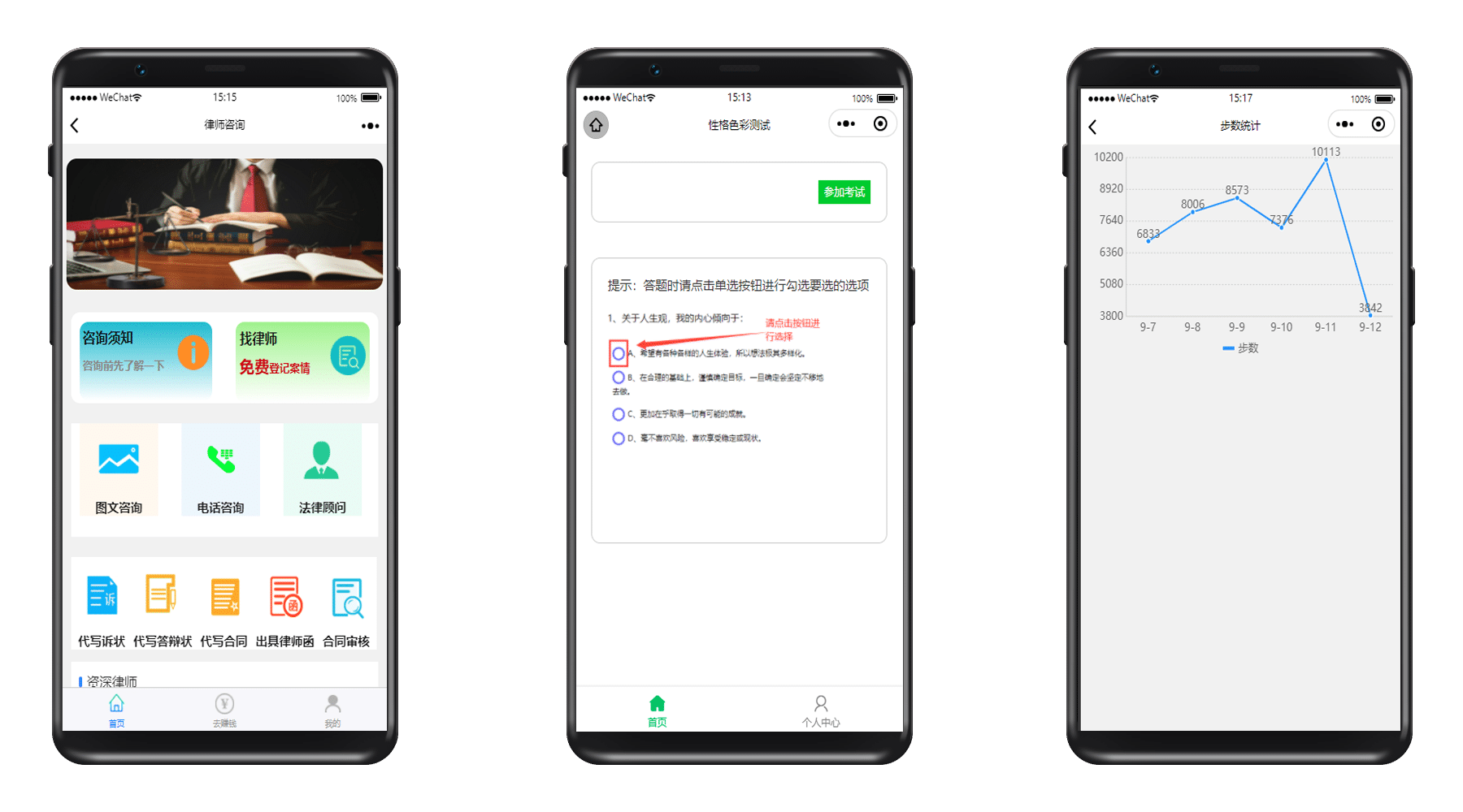 我们目前为客户开发过三类小程序,法律咨询、考试测评、以及运动统计;我们也可以根据需求,定制开发不同类型小程序。